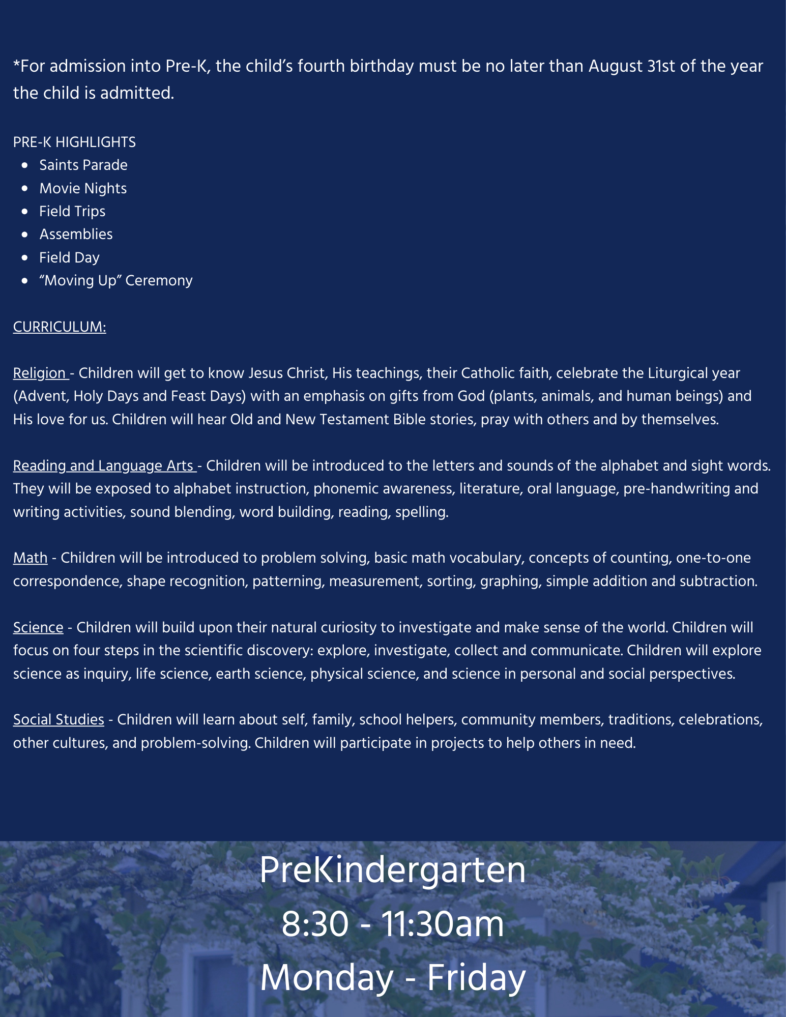 PRE-KINDERGARTENMonday - Friday8:30am - 11:30am Mrs. Cassandra Smithcasmith@sncsgh.org Ms. Miranda Roglianomrogliano@sncsgh.org Mrs. AnnMarie Ronquilloaronquillo@sncsgh.org