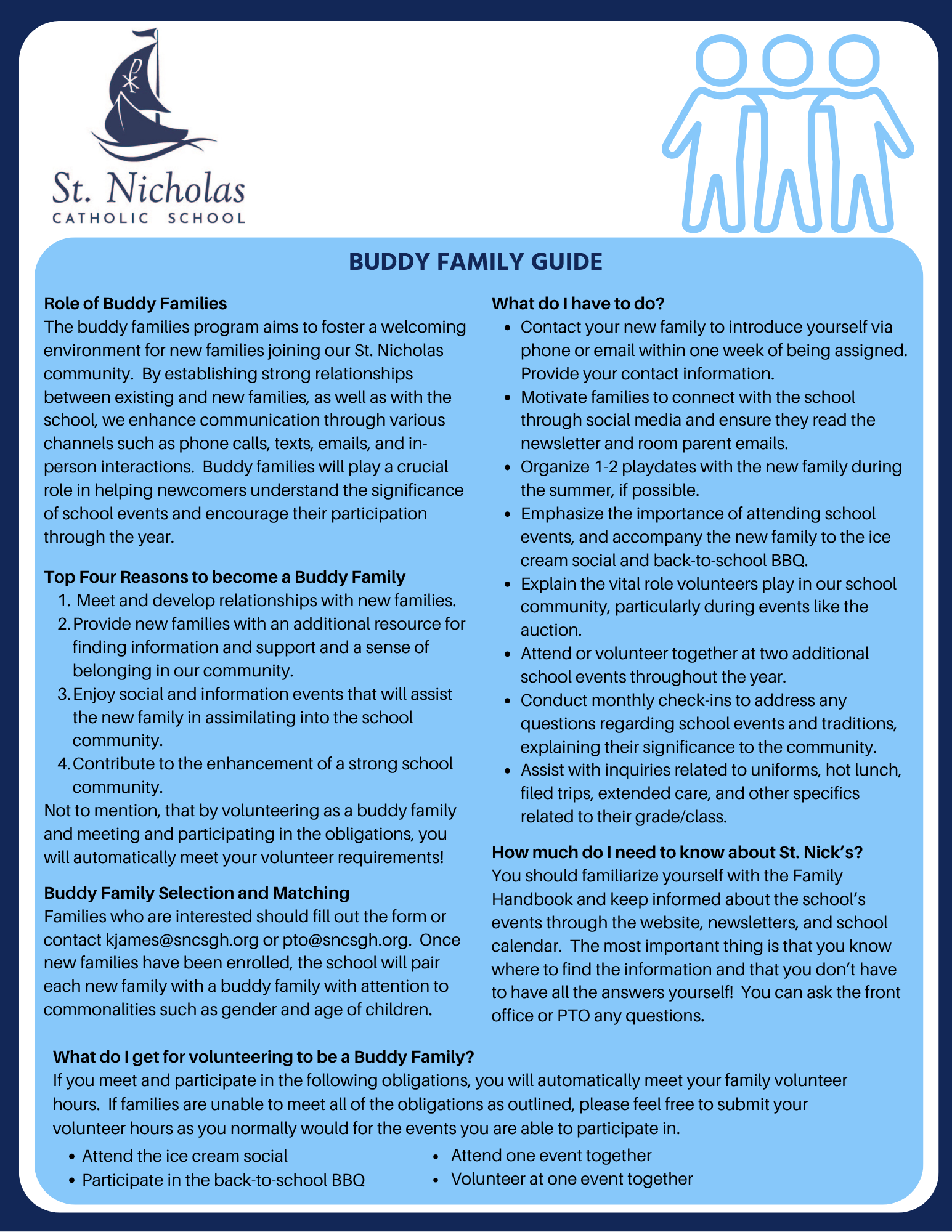 The Buddy Families program aims to foster a welcoming environment for new families joining our Saint Nicholas community. By establishing strong relationships between existing and new families, as well as with the school, we enhance communication through various channels such as phone calls, texts, emails, and in-person interactions. Buddy families will play a crucial role in helping newcomers understand the significance of school events and encourage their participation throughout the year. Please email pto@sncsgh.org or kjames@sncsgh.org with any questions.